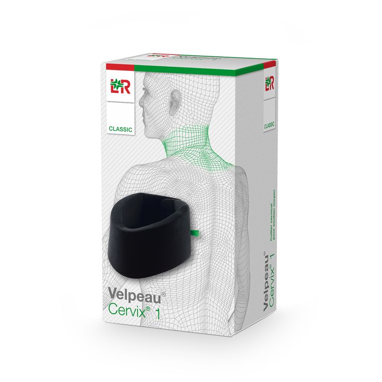 Designation: Anatomical ready-to-use cervical collar with reinforcement and chamfer under the chin for medium support.
